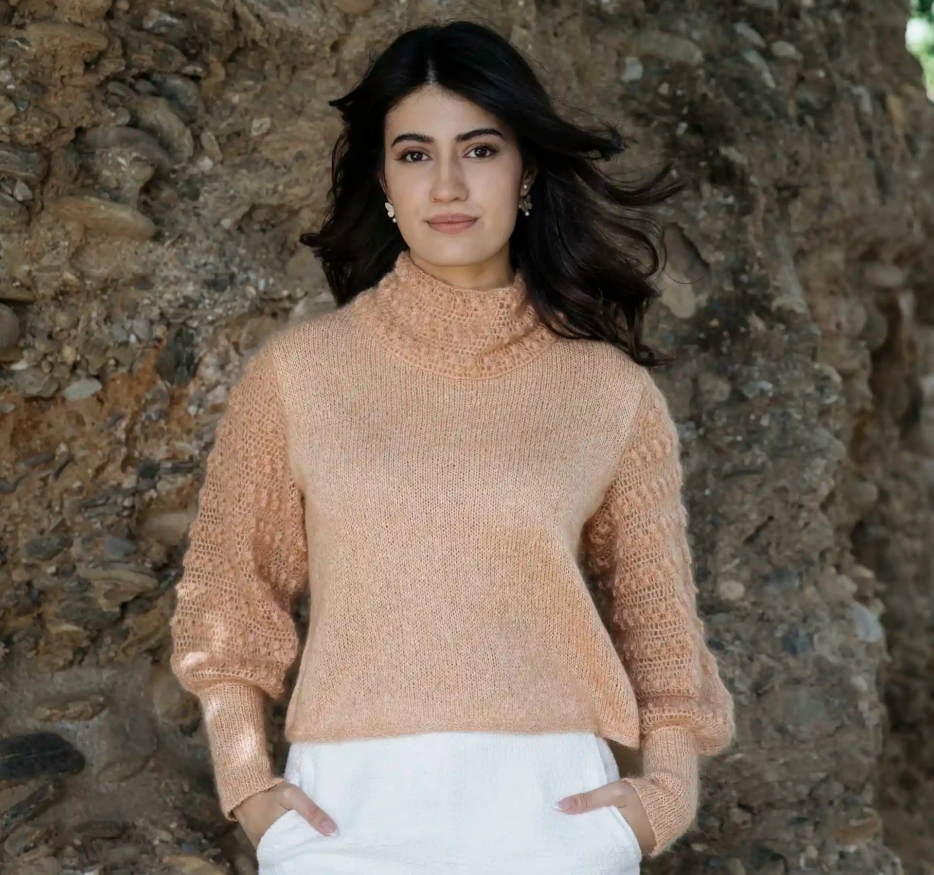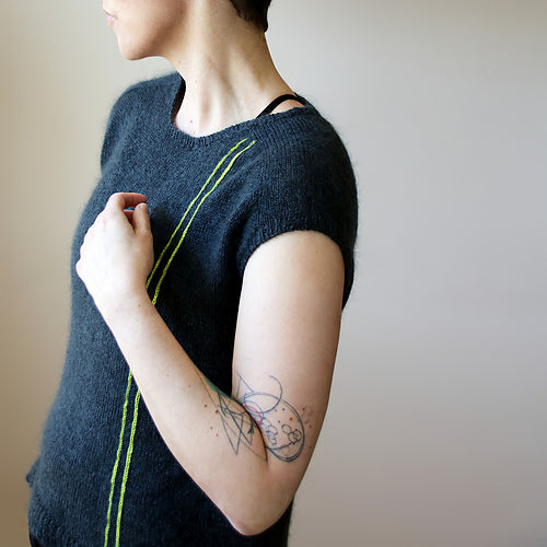 Kiki wird zweifädig aus So Kosho und Sensai von oben nach unten im Rippenmuster gestrickt. Der Pullover hat breite Raglanfäden, die in den Körper eingearbeitet sind. Die Ärmel sind leicht ausgestellt. Alle Zunahmen sollten in das Rippenmuster eingearbeitet werden.