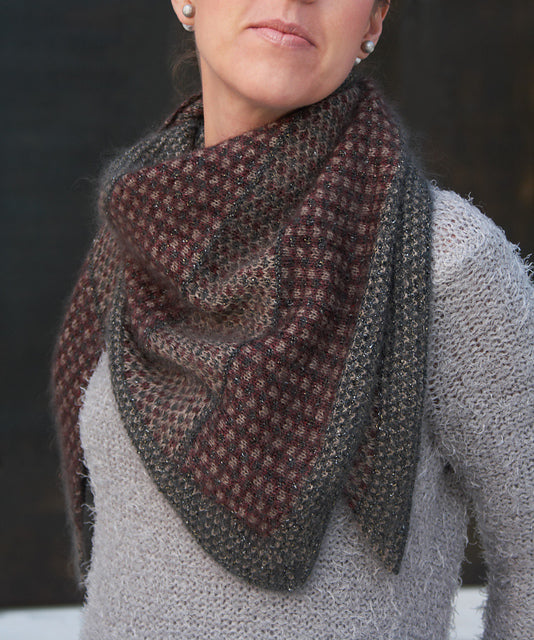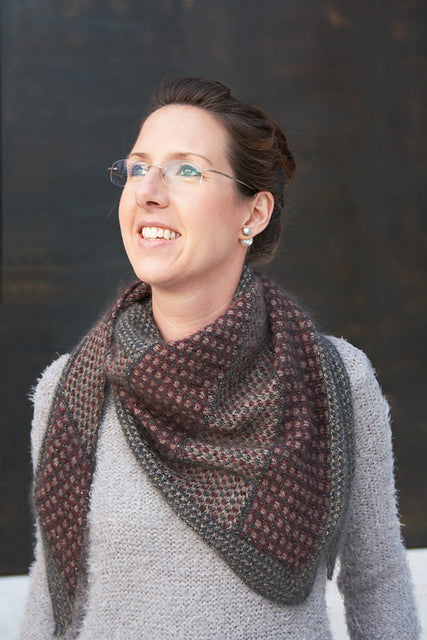 Ring in the season with Advent, which brings clean modern lines and an asymmetrical flair to traditional holiday colours. Dice check and waffle check slip stitch patterns create a subtle plaid that looks beautiful on both sides of the fabric. Advent is worked in modular log cabin stripes, and knit in Ito Kinu (silk) and Sensai (mohair and silk) yarns, with a glittering strand of Ito Kin Gin to add a hint of Advent magic. Buy the pattern here.