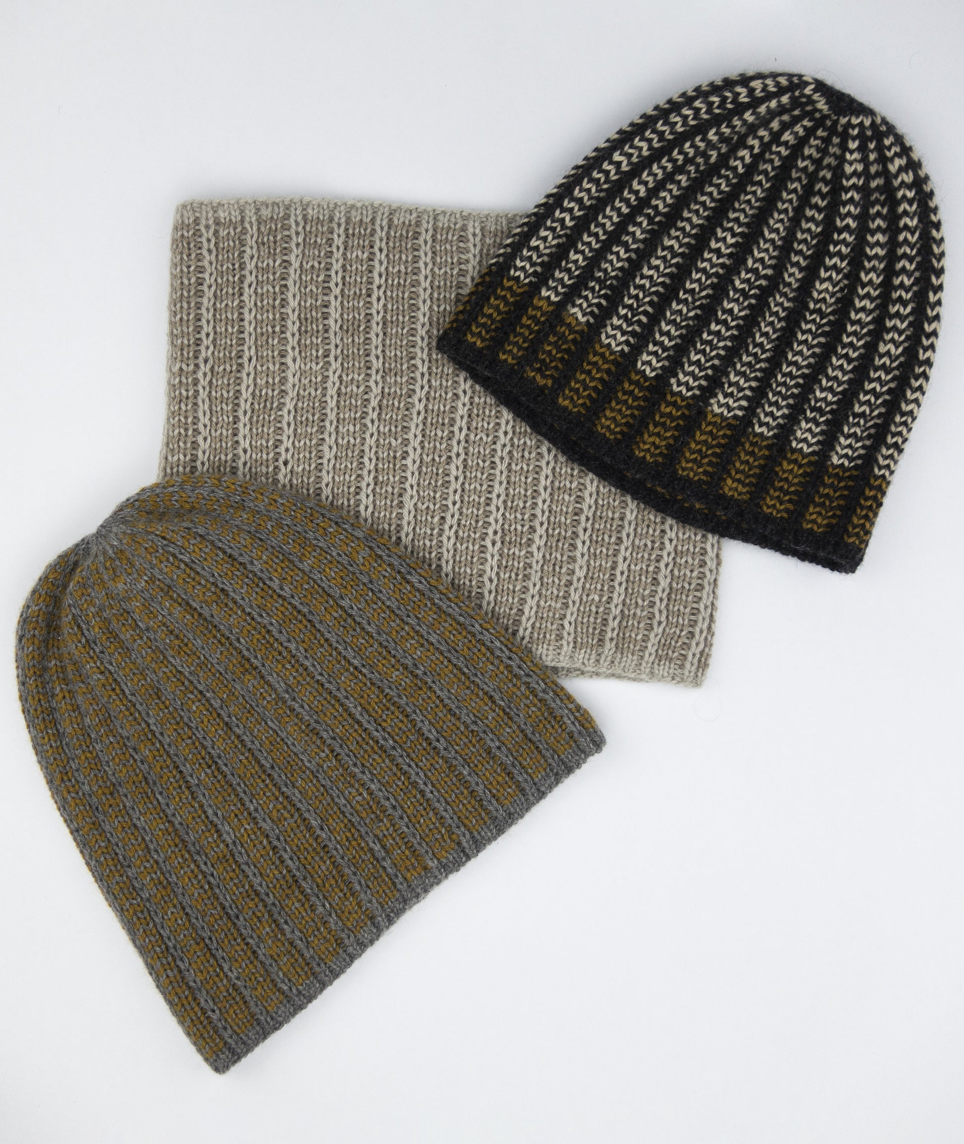 HAGI hat and cowl are knitted in the round with a slip stitch pattern. The cowl is in one size, the hat pattern offers two sizes and two lengths. For both the size is easy to customize. With 7 colors of ITO Kuroten 21 different color combinations can be knitted. When using highly contrasting colors the areas between the slip stitch rows are emphasized resulting in a very graphic effect; with similar color values the pattern appears calmer and the vertical lines of the slip stitches come to the foreground.