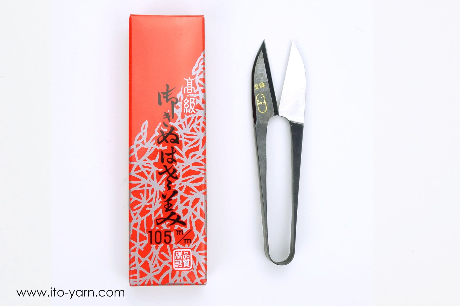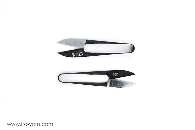 Klassische japanische Scheren zum Schneiden von Fäden. Die Klingen sind leicht geöffnet und schneiden beim Zusammendrücken. Die Bewegung ist komfortabel und schnell.