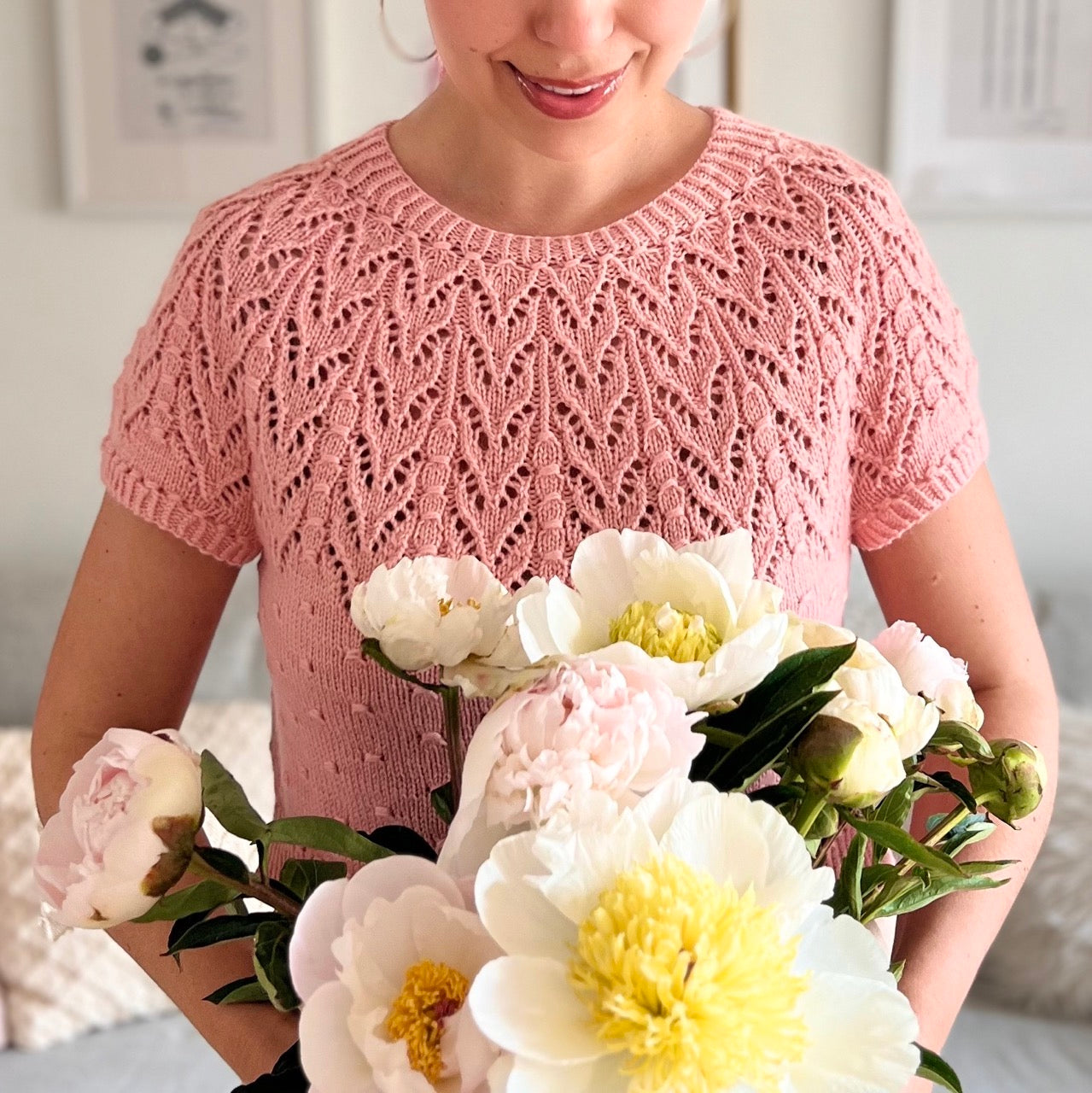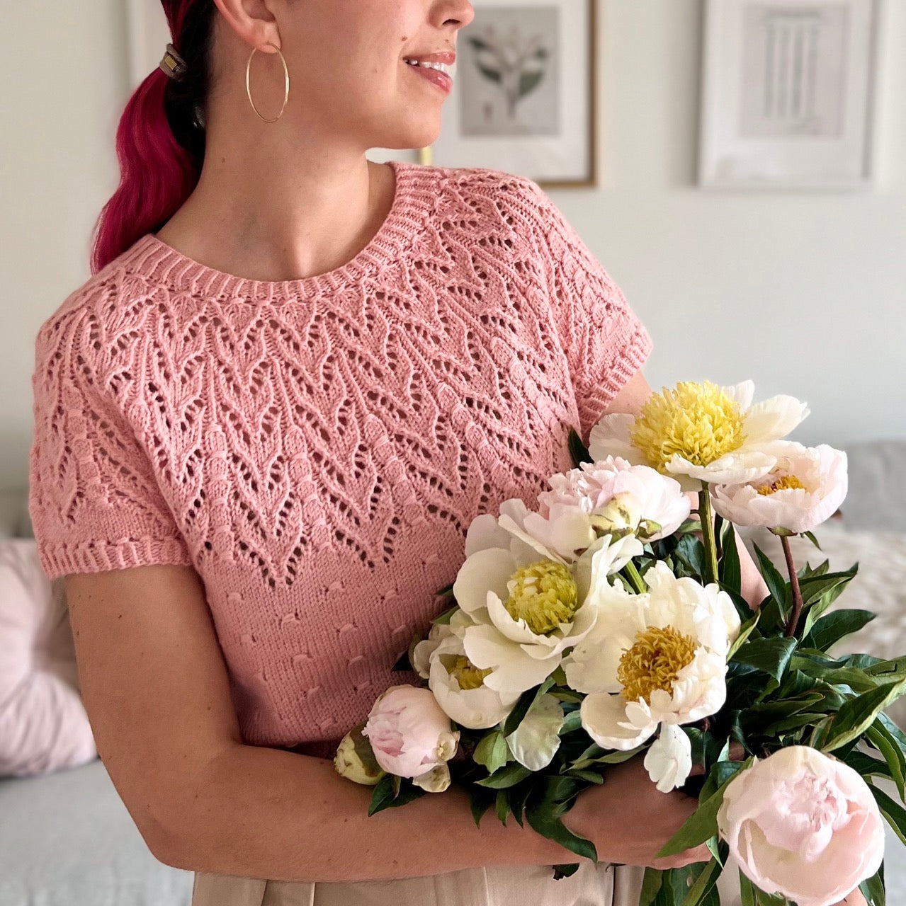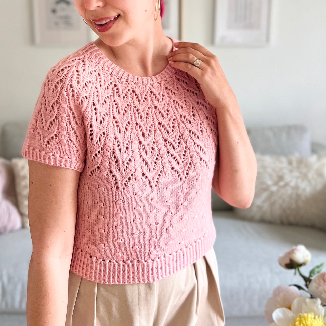 Cuore - "Herz" auf Italienisch - ist eine Liebeserklärung an Spitze und Textur. Dieses entzückende Strickstück ist voller kleiner Strukturdetails und zeigt ein Herzmuster, das sich über die Passe des T-Shirts zieht. Zarte Spitze, DK-Gauge und eine gerade Silhouette machen das Oberteil zu einer perfekten Ergänzung für die Garderobe bei warmem Wetter. Cuore Tee wird von oben nach unten gestrickt und hat eine runde Passe. Die Linien der Spitze werden durch die gedrehten Maschen gestrafft, und für den Halsausschnitt, die Bündchen und den Saum werden gedrehte Rippen verwendet. Umschlungene Maschen ziehen sich von der Passe bis hinunter zum Körper des T-Shirts, was das Strickstück optisch interessanter und unterhaltsamer macht. Der Halsausschnitt wird mit kurzen Reihen geformt, um eine bequeme Passform zu gewährleisten. Die Anleitungen sind sowohl grafisch als auch schriftlich dargestellt, und für die kniffligsten Techniken gibt es Videotutorials. Die Anleitung gibt es bei Ravelry.