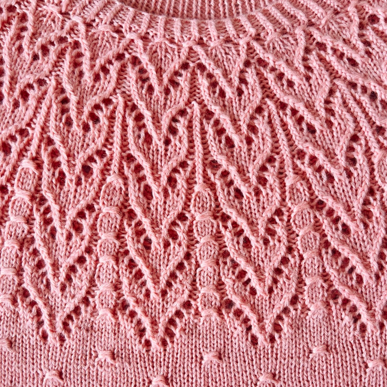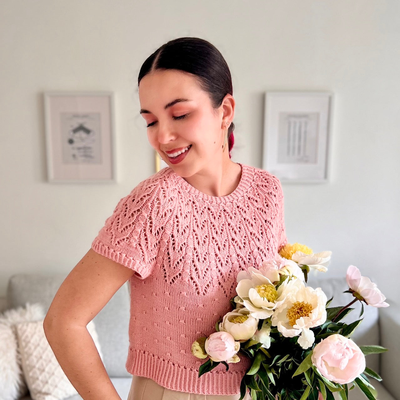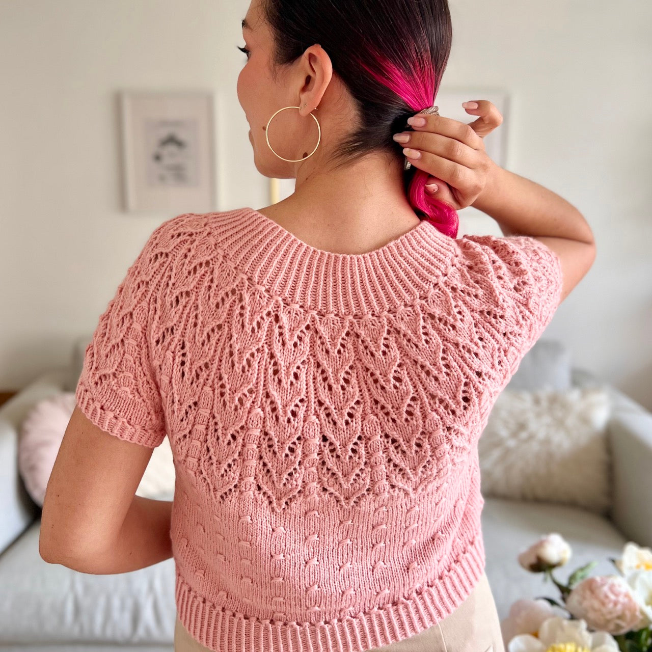 Cuore - "Herz" auf Italienisch - ist eine Liebeserklärung an Spitze und Textur. Dieses entzückende Strickstück ist voller kleiner Strukturdetails und zeigt ein Herzmuster, das sich über die Passe des T-Shirts zieht. Zarte Spitze, DK-Gauge und eine gerade Silhouette machen das Oberteil zu einer perfekten Ergänzung für die Garderobe bei warmem Wetter. Cuore Tee wird von oben nach unten gestrickt und hat eine runde Passe. Die Linien der Spitze werden durch die gedrehten Maschen gestrafft, und für den Halsausschnitt, die Bündchen und den Saum werden gedrehte Rippen verwendet. Umschlungene Maschen ziehen sich von der Passe bis hinunter zum Körper des T-Shirts, was das Strickstück optisch interessanter und unterhaltsamer macht. Der Halsausschnitt wird mit kurzen Reihen geformt, um eine bequeme Passform zu gewährleisten. Die Anleitungen sind sowohl grafisch als auch schriftlich dargestellt, und für die kniffligsten Techniken gibt es Videotutorials. Die Anleitung gibt es bei Ravelry.