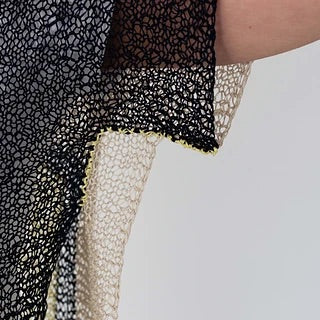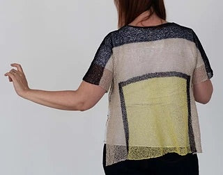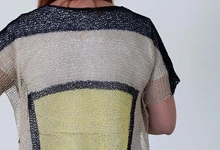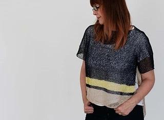 "Far Horizons" ist ein locker sitzendes T-Shirt, das in einem Stück flach gestrickt und dann zusammengenäht wird. Die ungewöhnliche Form ergibt sich daraus, dass das Vorderteil schmaler ist als das Rückenteil und dass die Ärmelnähte entlang der Armausschnitte weitergeführt werden. Wir beginnen mit dem Stricken des Vorderteils in breiten, kraus rechts gestrickten Streifen, gefolgt von einem Abschnitt in nur einer der Farben. Die Maschen für die Ärmel werden an den Unterarmen angeschlagen. Die Maschen in der Mitte der Arbeit werden abgekettet, um einen Bootsausschnitt zu formen, und die Arbeit wird auf der Rückseite des Pullovers fortgesetzt; an einem bestimmten Punkt wird eine weitere Farbe hinzugefügt. Dann werden die Maschen an den Ärmeln abgekettet und die Arbeit auf der Rückseite fortgesetzt, die ein interessantes Intarsienmotiv aufweist. Die Rückseite des Pullovers ist länger als die Vorderseite. Schließlich werden die Ärmel und die Unterarme in einer Kontrastfarbe genäht. Die Anleitung gibt es bei Ravelry.