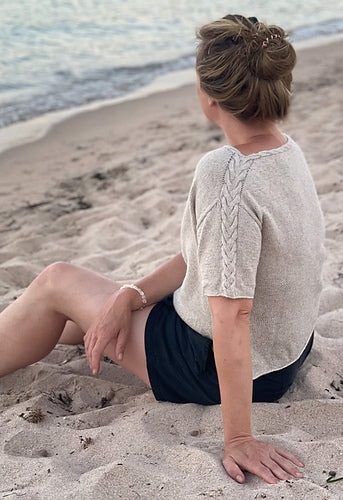 Das Hedda Tee wird von oben nach unten mit Sattelschultern gestrickt. Zuerst werden zwei Zöpfe für den Halsausschnitt gearbeitet. Diese vereinen sich an den Schultern und laufen über die Ärmel weiter. Verkürzte Reihen im Nackenbereich sorgen für eine gute Passform. Nach den Schulterzunahmen werden Vorderteil und Rücken getrennt voneinander gearbeitet, um die Armausschnitte zu formen. Am glatt rechts in Runden gestrickten Körper werden die Doppelzöpfe der Ärmel als Seitennaht aufgegriffen. Wenige Zentimeter vor Ende werden Vorderteil und Rücken geteilt. Die Zöpfe laufen dann seitlich der Schlitze als einfache Zöpfe wie am Halsausschnitt bis zum Ende des Körpers, der mit einem I-Cord abgekettet wird, weiter. Die Ärmel können wahlweise als überschnittene Ärmel oder als T-Shirt Ärmel – dann mit einer durch verkürzte Reihen geformten Armkugel – gestrickt werden und enden ebenfalls mit einem I-Cord. Die Anleitung gibt es hier.