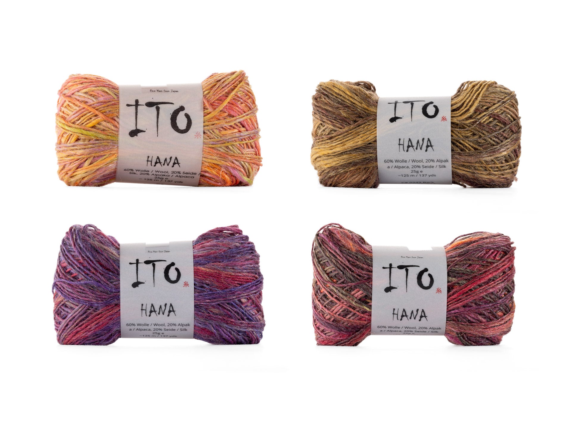 ITO Hana ist ein wahres Wunderwerk der Farben! Dieses Garn beeindruckt durch seine einzigartige Färbung und Spinnung, die ein abwechslungsreiches Farbthema im Garnverlauf erzeugen. Das Ergebnis ist ein lebendiges und faszinierendes Strickerlebnis, bei dem jedes Projekt zu einem Unikat wird. Ob gestrickt oder gehäkelt, es macht Spaß, mit ITO Hana zu arbeiten, und die fertigen Stücke sind ein echter Hingucker.