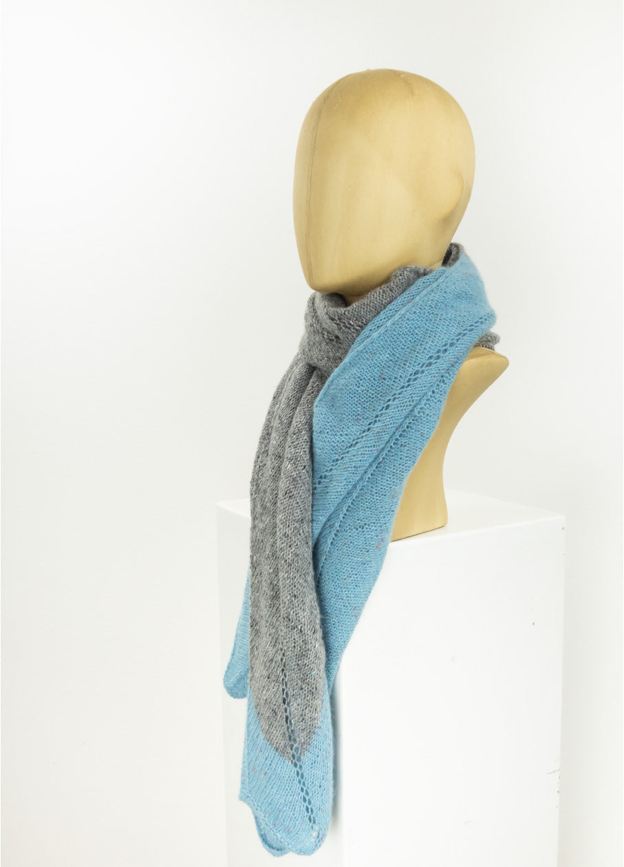 Der TADAMI Schal zeichnet sich durch ein großes Chevron-Muster mit asymmetrisch angeordneten Farbblöcken aus. Es gibt 2 Versionen, in denen die Farbblöcke unterschiedlich lang sind. Das Muster wird in den Hin- und Rückreihen identisch gearbeitet und ist auch für Anfänger geeignet, die Umschläge arbeiten und Maschen abnehmen können. Der Rand des Schals wird als I-Cord gestrickt. Der moderne Look in Kombination mit dem ultraweichen Streichgarn ITO Karei aus Kaschmirtweed macht diesen Schal zum Lieblingsstück.