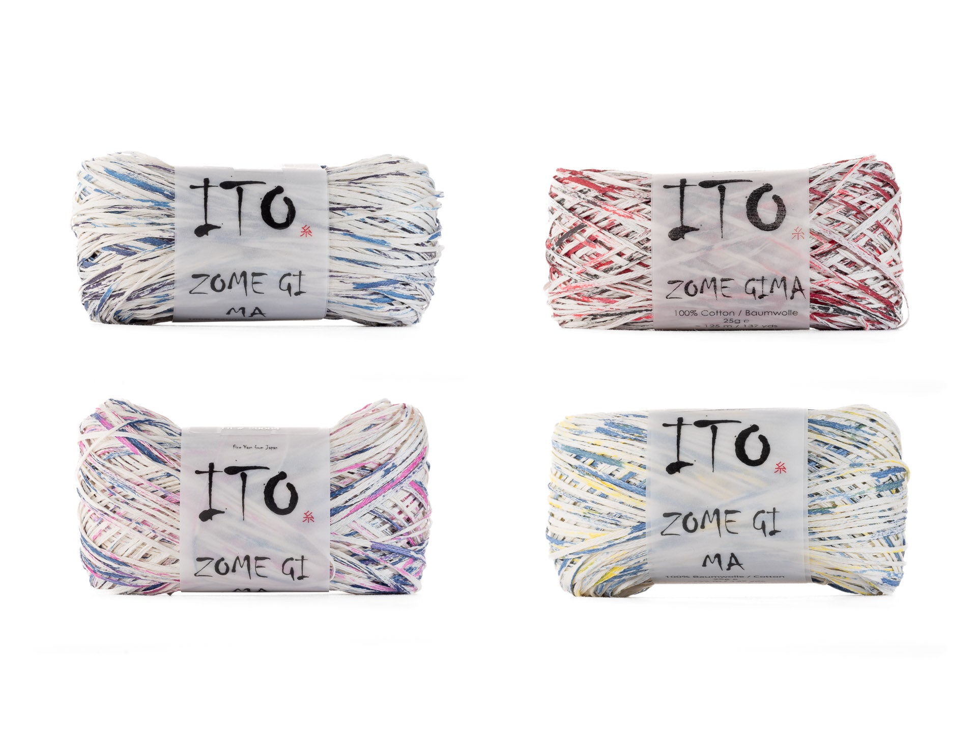 ITO Zome Gima ist eine faszinierende Variation des beliebten flachen Baumwollgarns ITO Gima 8.5, jedoch etwas breiter. Dieses außergewöhnliche Garn wird in einem aufwendigen handwerklichen Prozess Zentimeter für Zentimeter mit zwei Farben unregelmäßig und mit unterschiedlicher Farbintensität bedruckt.