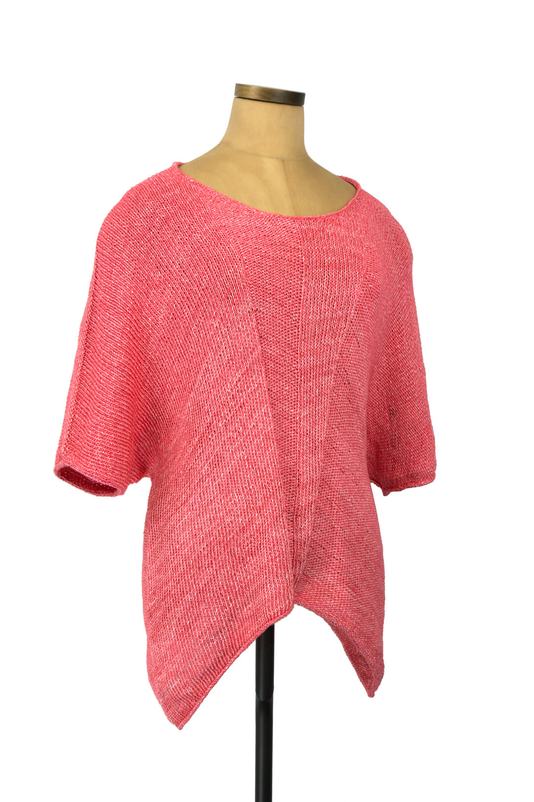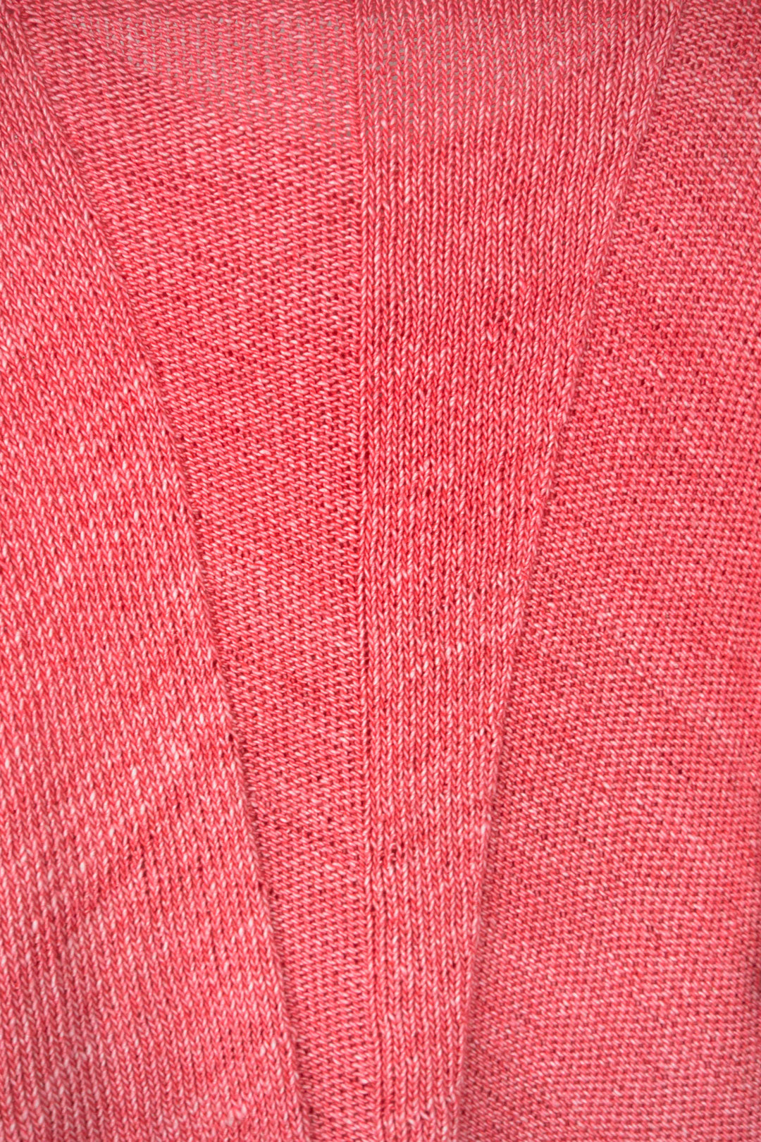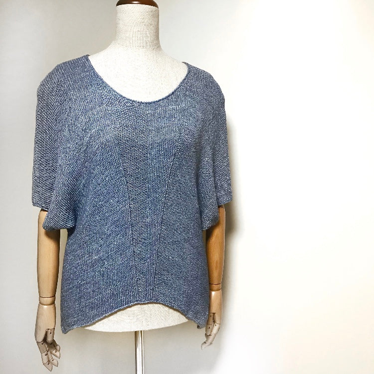 Nami wurde mit einem Garn entworfen, das sehr ungewöhnlich aussieht und sich auch so verhält. ITO Mizu ist ein ungedrehtes Baumwollgarn. Während es durch das Färbebad läuft, nimmt der Strang die Farbe oberflächlich auf. Danach wird die Farbe nur leicht fixiert. Beim Stricken bricht die Farbe auf, und der rohe weiße Baumwollstrang wird sichtbar, was dem Garn ein gebrauchtes Aussehen verleiht. Die Farbe geht beim Stricken auf die Finger über, kann aber durch Waschen der Hände mit normaler Seife leicht entfernt werden. Während des Einweichens meines Musters war die Farbstoffübertragung weniger ein Problem als bei anderen handgefärbten Garnen, die ich zuvor verwendet hatte - also keine Sorge! Die dem Garn innewohnende Drehung sorgt für ein verzogenes Gewebe, das ich genutzt habe, um das Muster zu gestalten, ohne kurze Reihen einzubauen. Wenn Sie ein gleichmäßiges Garn für dieses Muster verwenden, erhalten Sie nicht den abgebildeten Look. Die Anleitung gibt es bei Ravelry.