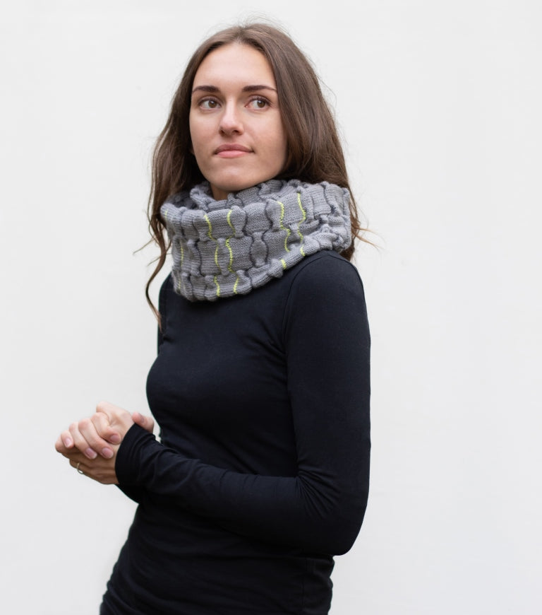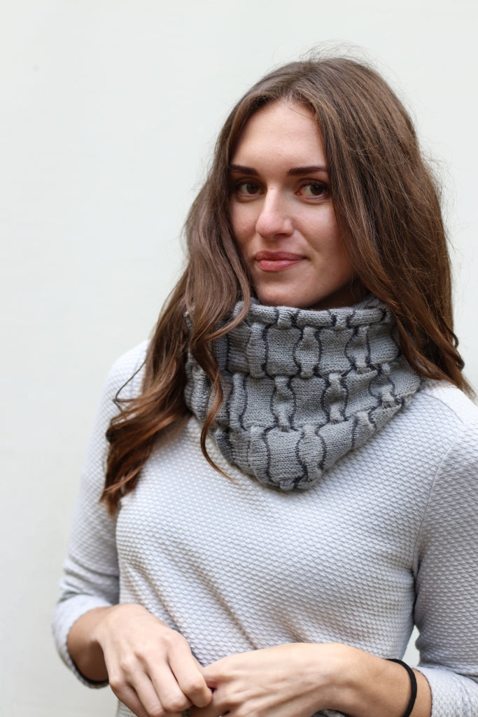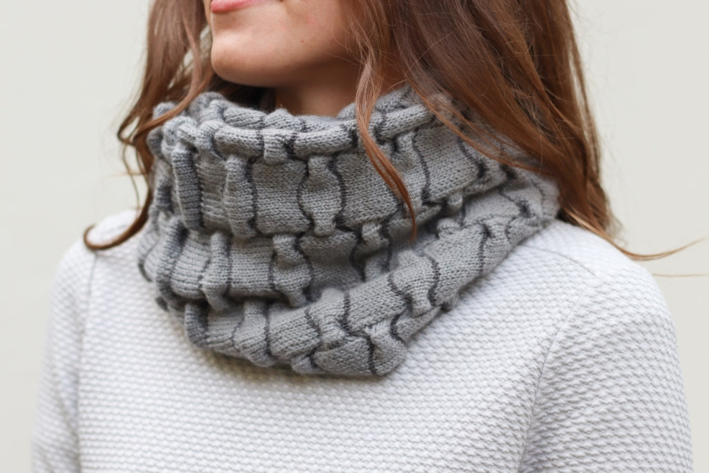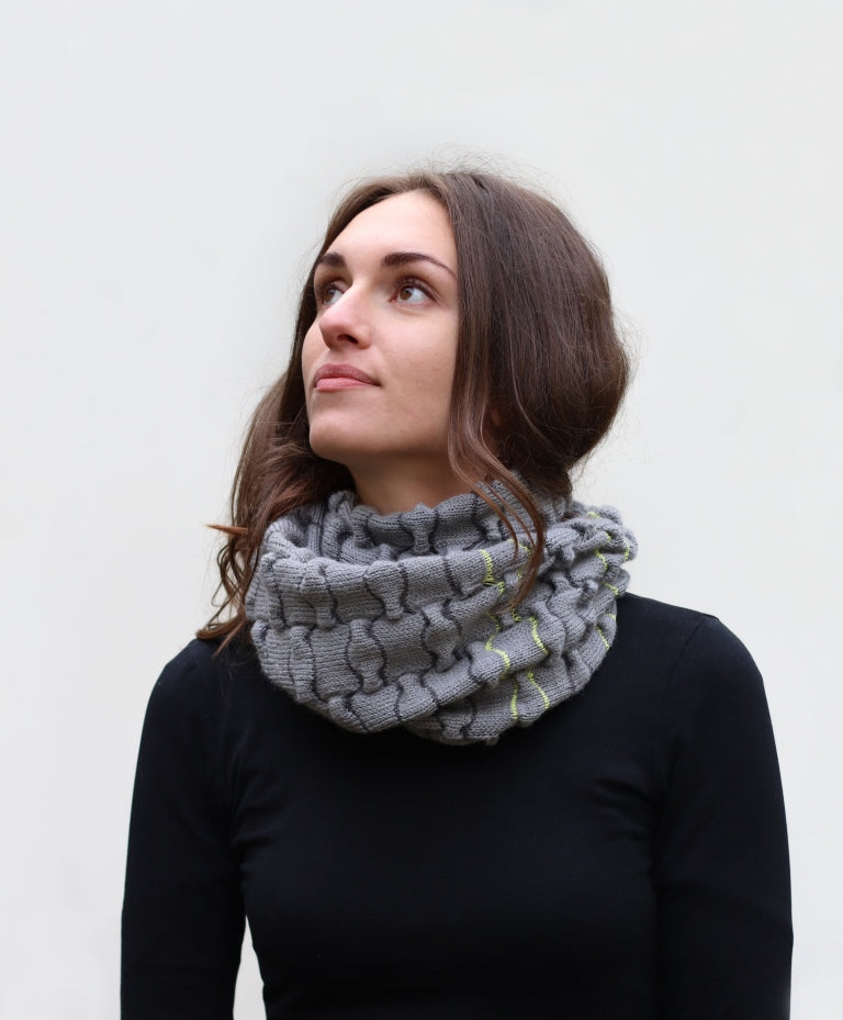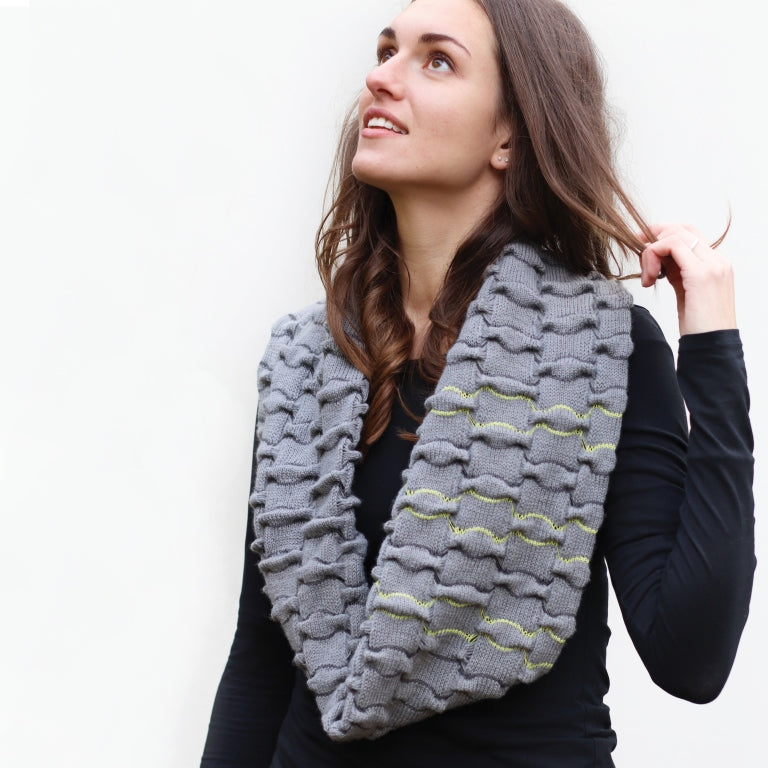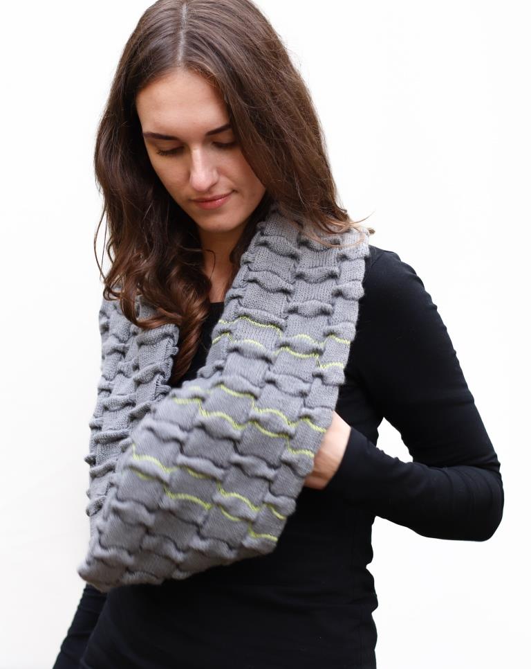 Ono ist ein Schlauch-Loop, der in Runden gestrickt wird. Anschließend verbindet der Maschenstich die beiden Enden des Schlauches zum Loop. Die dreidimensionale Textur besteht aus eingestrickten Falten: Alle zwölf Runden werden Falzmaschen gearbeitet. Diese Falzmaschenrunde sowie eine weitere Runde werden mit dünneren Nadeln und einem Lacegarn (ITO Washi) gestrickt und trennen die bonbonförmigen Elemente des Loops voneinander. Zwischen diesen beiden Runden geht es mit ITO Rakuda in Sockengarnstärke glatt rechts weiter, was für Entspannung beim Stricken sorgt. Die Falzmasche ist ein wenig ungewöhnlich, aber nicht sehr kompliziert. Ein Fototutorial erklärt genau, wie sie gestrickt wird. Die Anleitung gibt es bei Ravelry.