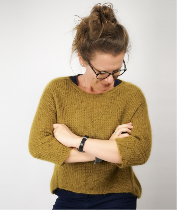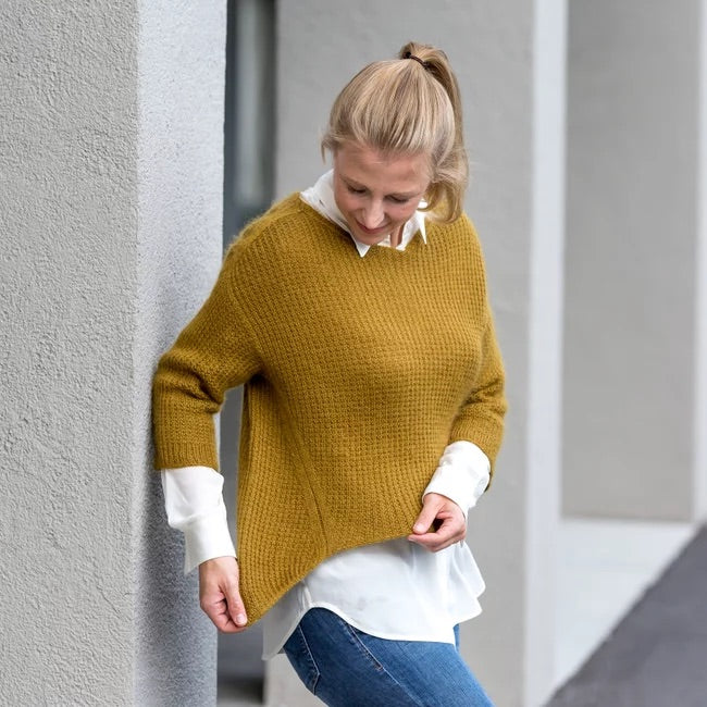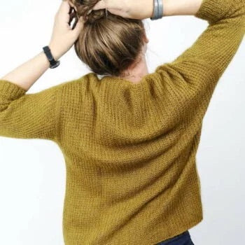 Der Strukturmusterpulli SAIKI wird zweifädig mit je einem Faden Rakuda und einen Faden Sensai von unten nach oben gestrickt. Begonnen wird mit der Verlängerung des Rückens, bevor für das Vorderteil weitere Maschen angeschlagen und die Arbeit zur Runde geschlossen wird. Gegenläufige Zu- und Abnahmen lassen auf beiden Seiten schräg laufende Linien entstehen. Unter den Armen wird die Arbeit geteilt und Vorderteil und Rücken getrennt voneinander weiter gearbeitet. Wieder vereint geht es mit Abnahmen für die Schultern und der Formung des Halsausschnittes weiter bis zum abschließenden Halsbündchen. Aus den entstandenen Kanten der Armlöcher werden für die Ärmel Maschen aufgenommen und die Dreiviertelärmel in Runden gearbeitet. Die Anleitung gibt es hier.