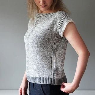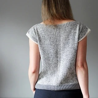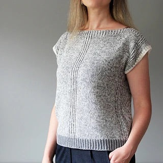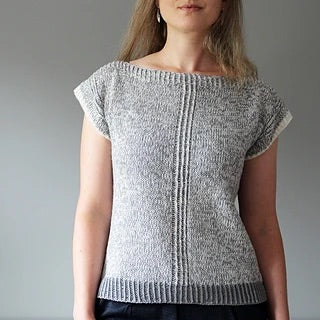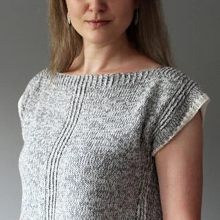 Dieses hübsche T-Shirt zeigt eine lustige Art, zwei Farben aus Fingerling-Garn in einem modernen Stück für den Alltag zu kombinieren. Das "Sprinkle Tee" wird in zwei Farben gestrickt, wobei jeweils ein Strang zusammengehalten wird, um einen Sprinkle-/Marmoreffekt zu erzeugen. Das Design zeichnet sich durch klare Linien aus gedrehten Rippenbändern und Stockinette-Stichen aus, um einen sauberen Hintergrund zu schaffen, der die Garne und den Sprinkle-Effekt zur Geltung kommen lässt. Saum und Ärmelbündchen heben jede Farbe einzeln hervor. Es handelt sich um einen locker sitzenden, kurzärmeligen Pullover mit einem kastenförmigen Körper, einem Bootsausschnitt und überschnittenen Schultern. Die Konstruktion ist von oben nach unten gearbeitet, nahtlos in einem Stück. Das obere Vorder- und Rückenteil wird ab dem Schulteranschlag flach gearbeitet, dann wird der Körper in der Runde bis zum Saum gearbeitet. Die Ärmel werden aufgegriffen und in der Runde gestrickt. Die Anleitung gibt es bei Ravelry.